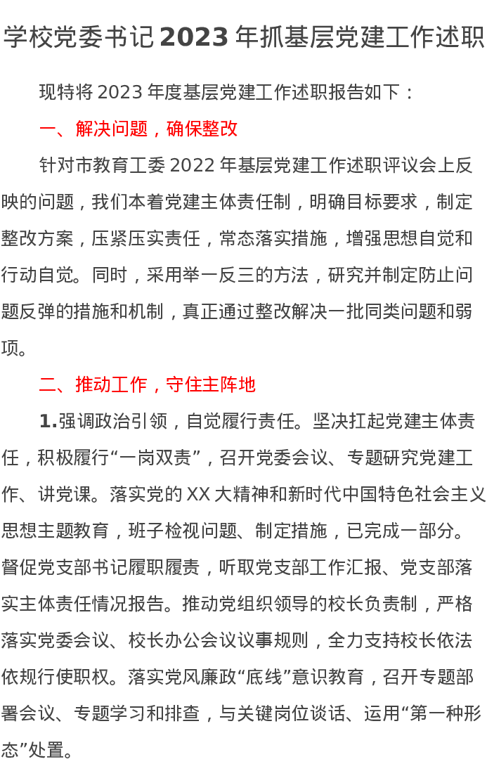 学校党委书记2023年抓基层党建工作述职
