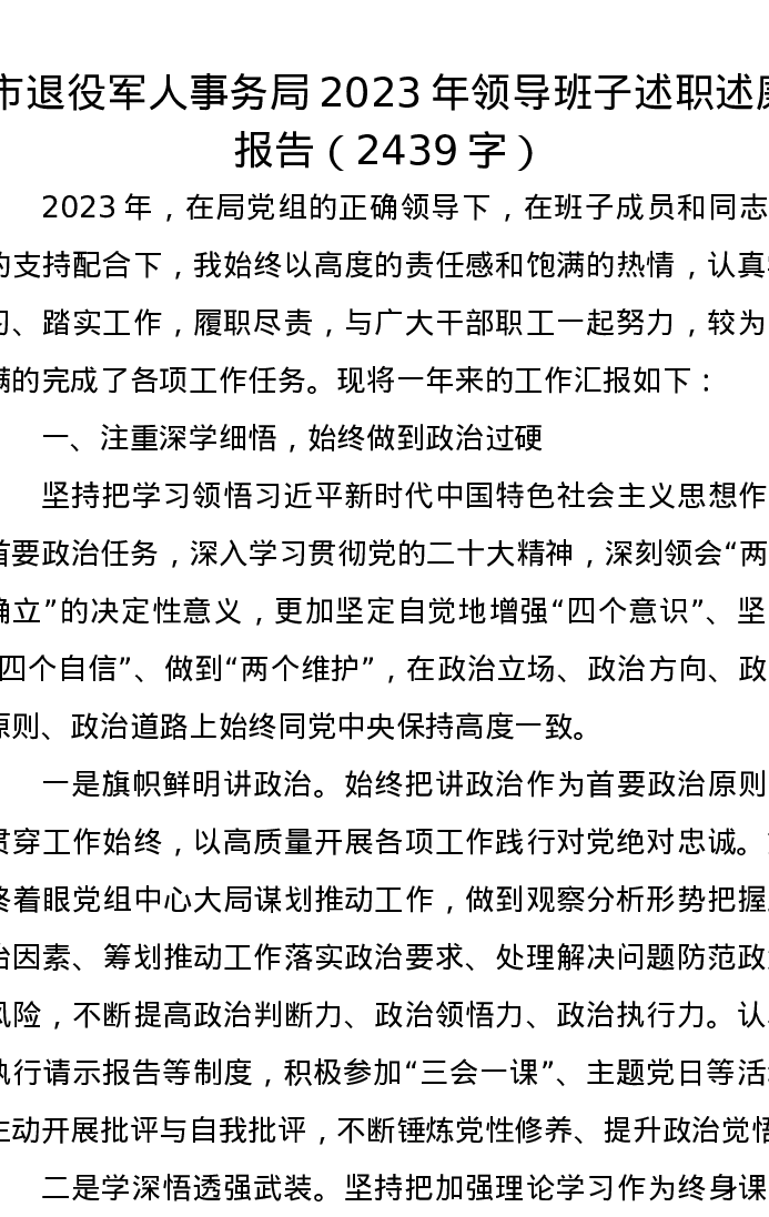 市退役军人事务局2023年领导班子述职述廉报告