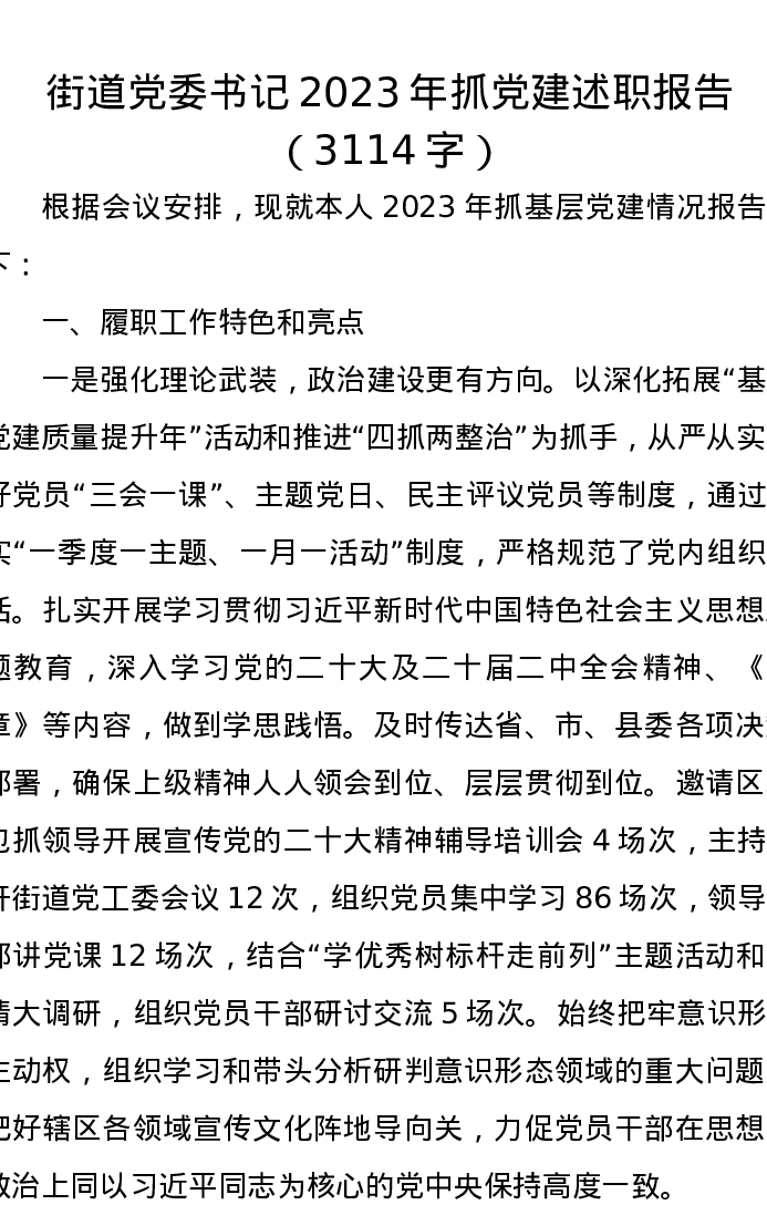 街道党委书记2023年抓党建述职报告