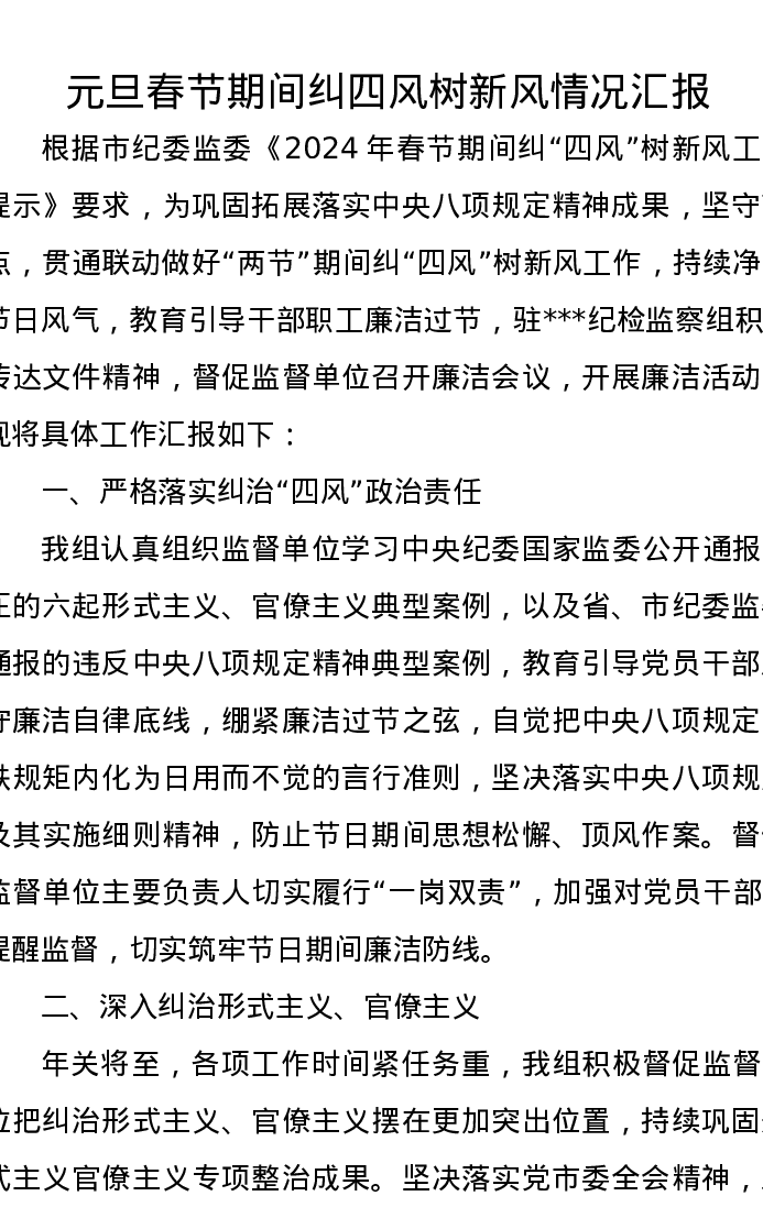 元旦春节期间纠四风树新风情况汇报