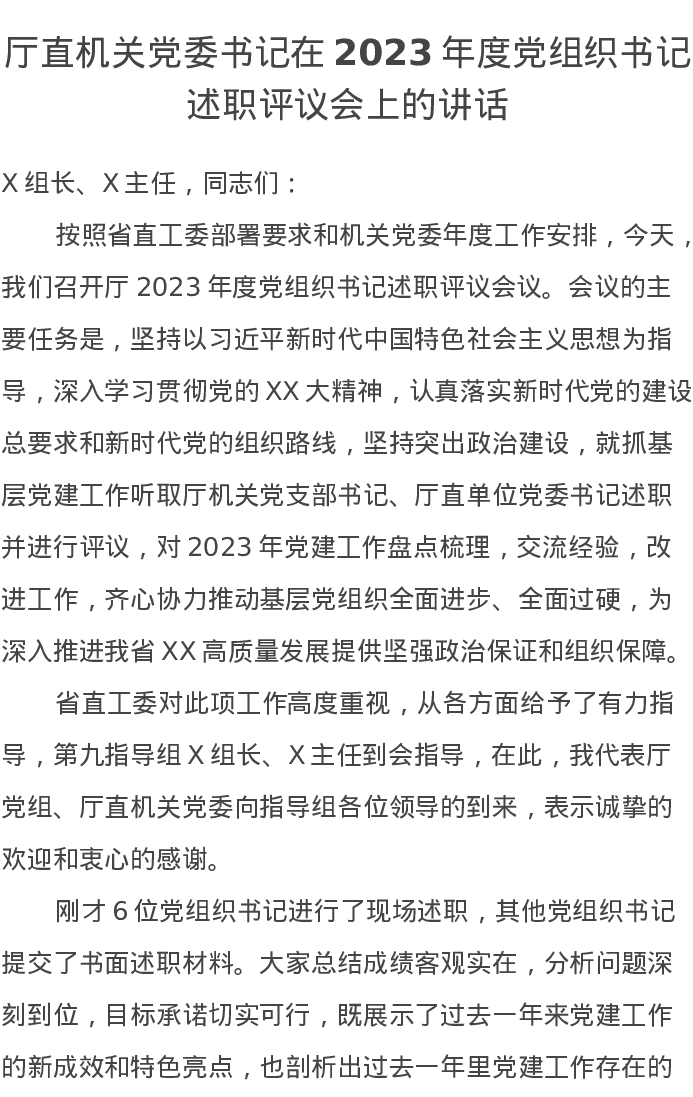 厅直机关党委书记在2023年度党组织书记述职评议会上的讲话