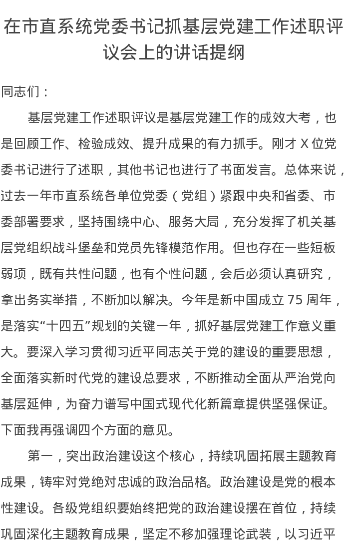 在市直系统党委书记抓基层党建工作述职评议会上的讲话提纲