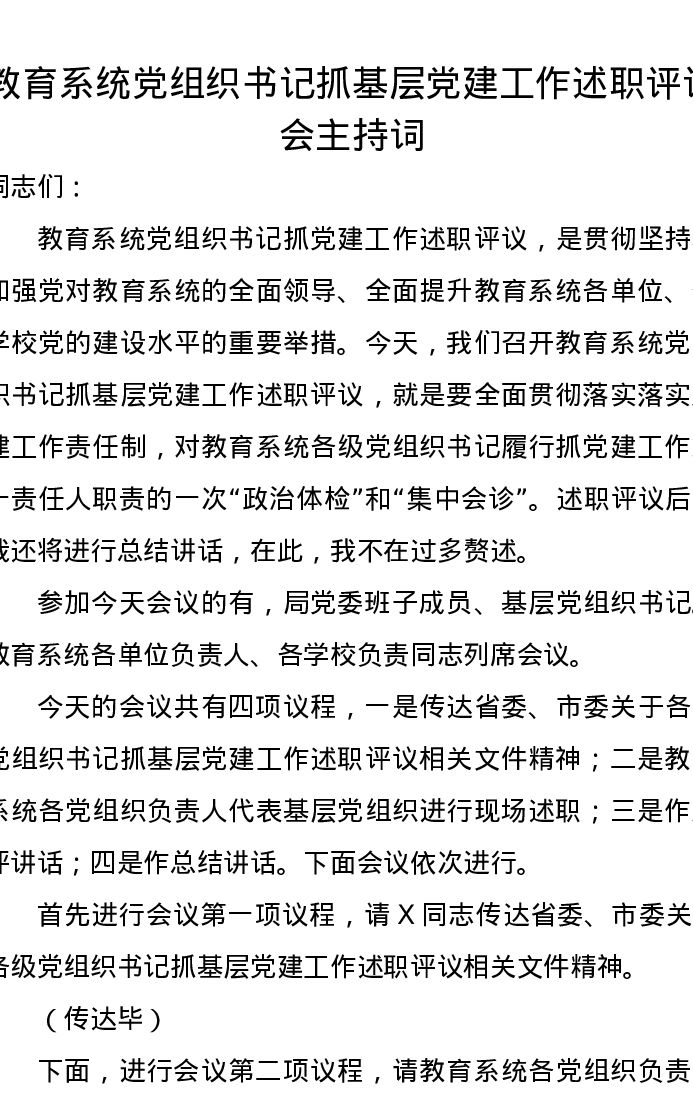 教育系统党组织书记抓基层党建工作述职评议会主持词
