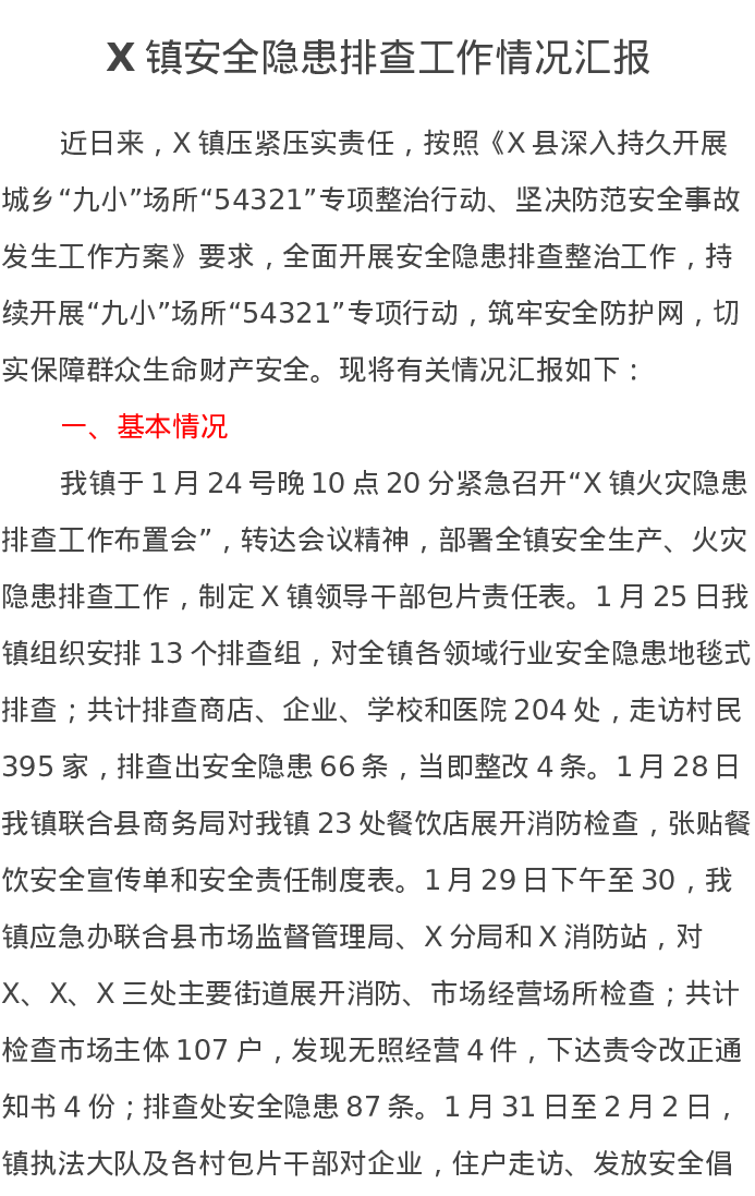 X镇安全隐患排查工作情况汇报