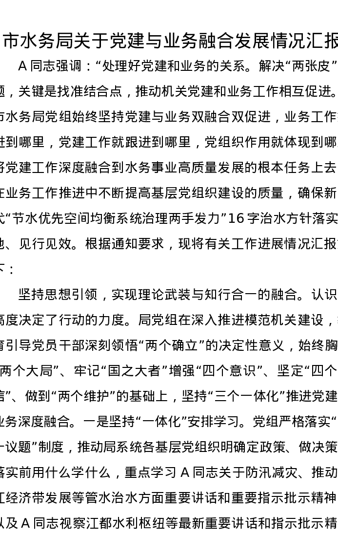 市水务局关于党建与业务融合发展情况汇报