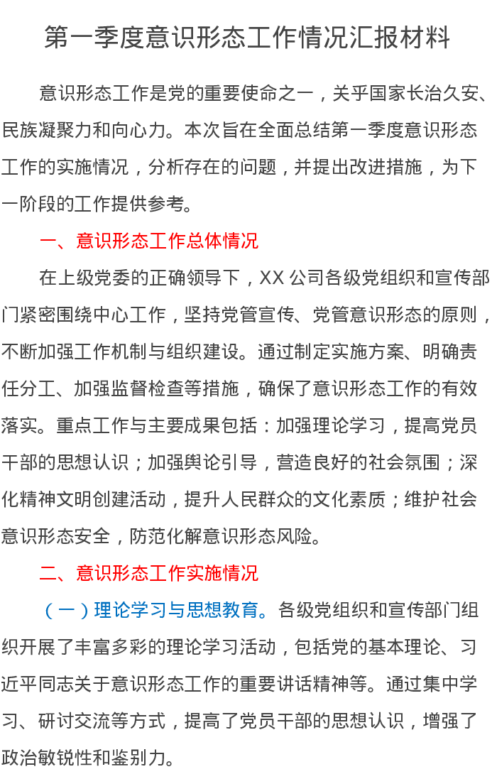 第一季度意识形态工作情况汇报材料