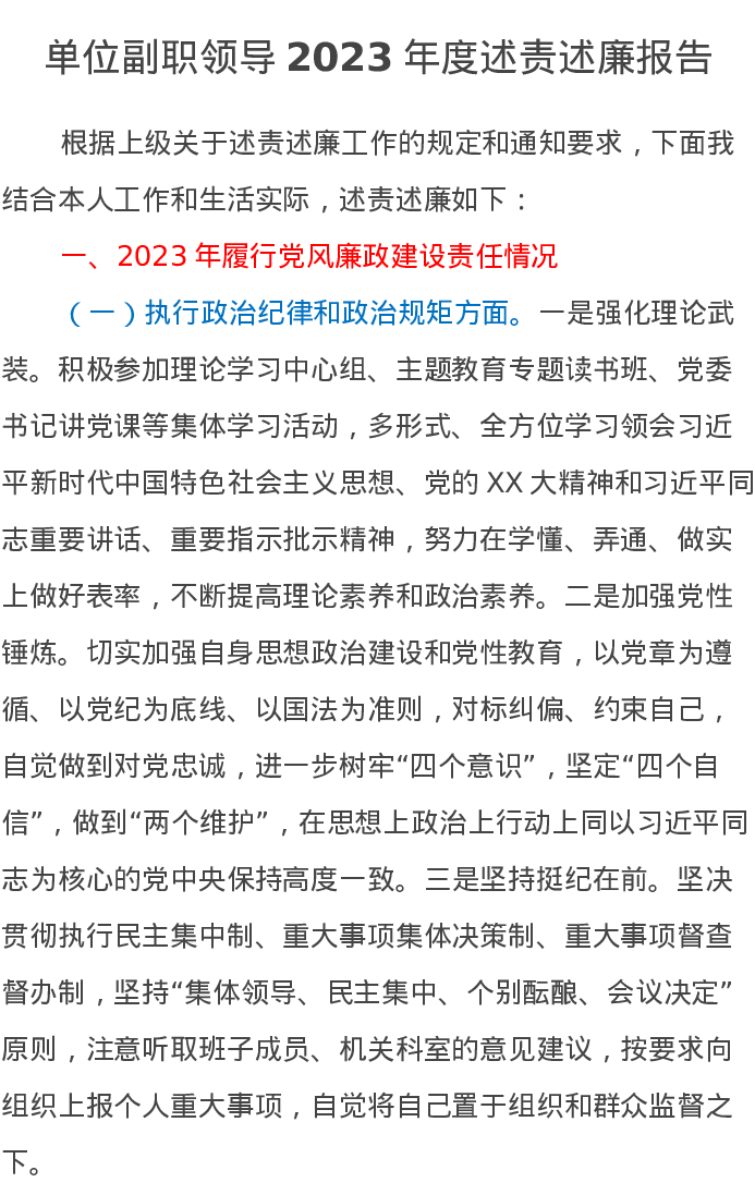 单位副职领导2023年度述责述廉报告