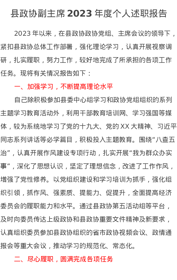 县政协副主席2023年度个人述职报告