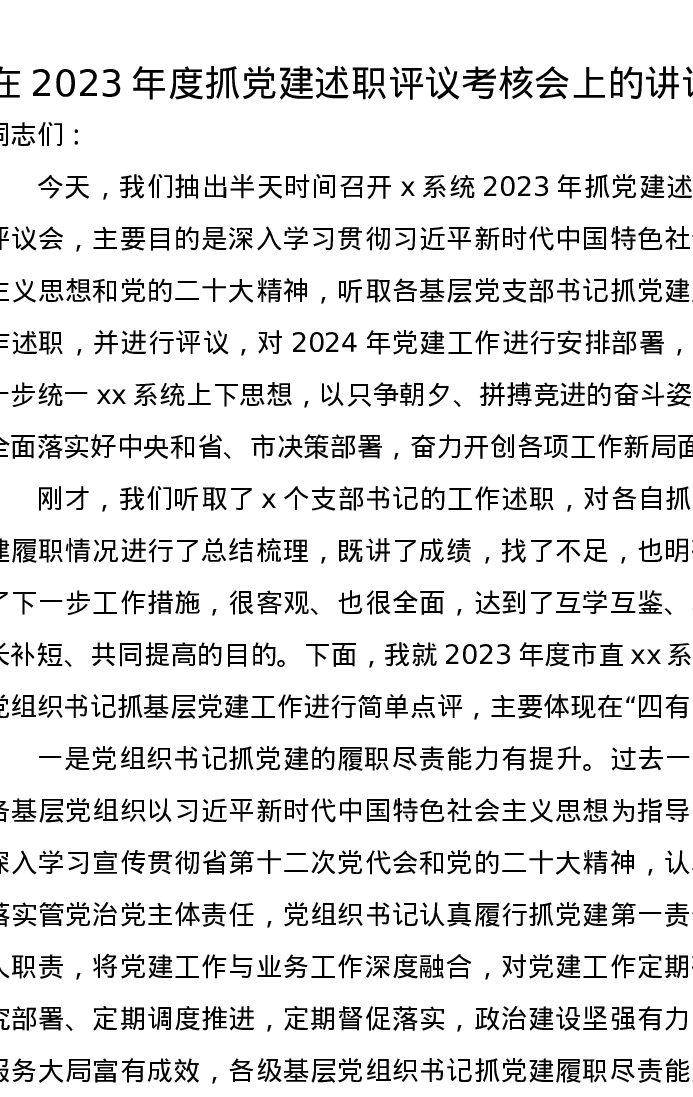 在2023年度抓党建述职评议考核会上的讲话