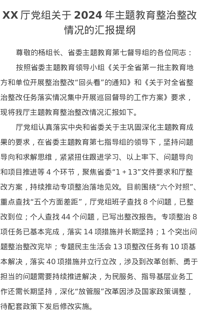 XX厅党组关于2024年主题教育整治整改情况的汇报提纲