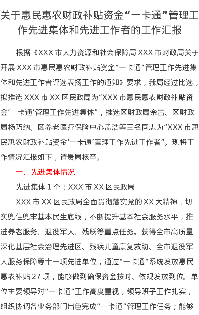 关于惠民惠农财政补贴资金“一卡通”管理工作先进集体和先进工作者的工作汇报