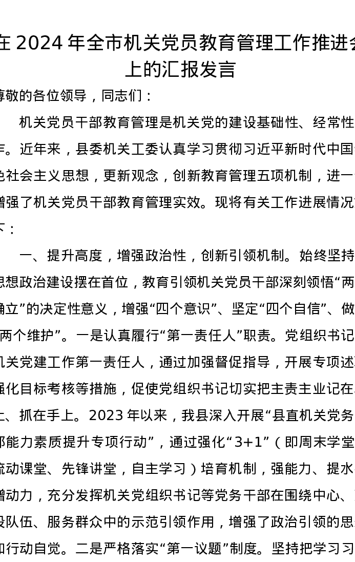 在2024年全市机关党员教育管理工作推进会上的汇报发言