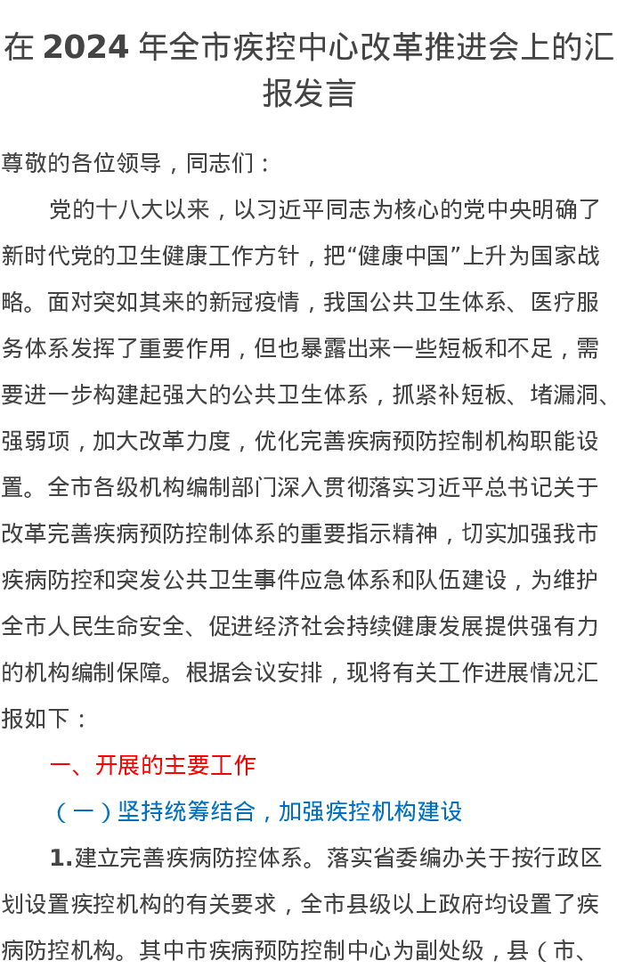 在2024年全市疾控中心改革推进会上的汇报发言
