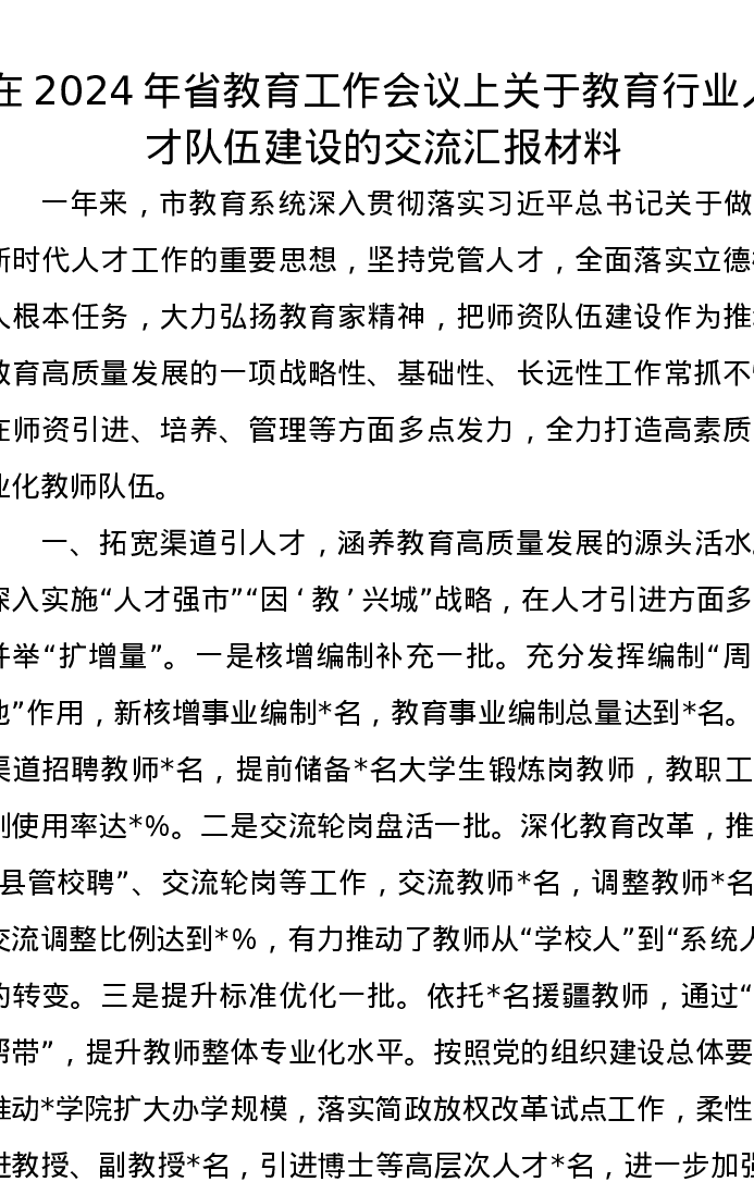 在2024年省教育工作会议上关于教育行业人才队伍建设的交流汇报材料