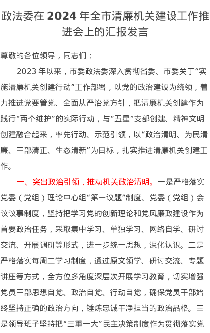 政法委在2024年全市清廉机关建设工作推进会上的汇报发言