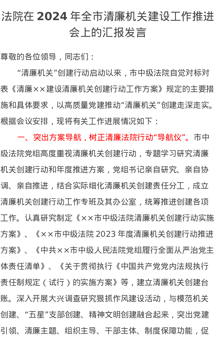 法院在2024年全市清廉机关建设工作推进会上的汇报发言