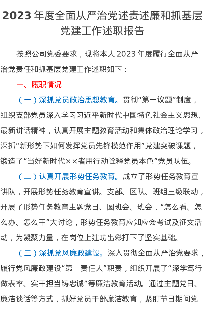 2023年度全面从严治党述责述廉和抓基层党建工作述职报告