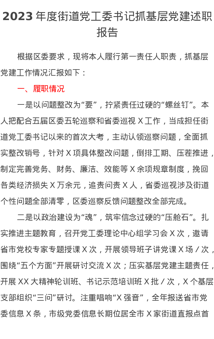 2023年度街道党工委书记抓基层党建述职报告