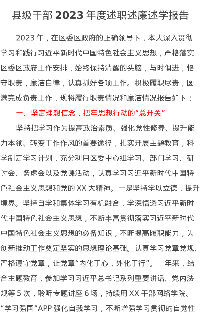 县级干部2023年度述职述廉述学报告