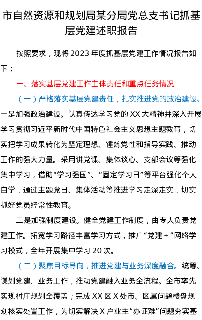 市自然资源和规划局某分局党总支书记抓基层党建述职报告