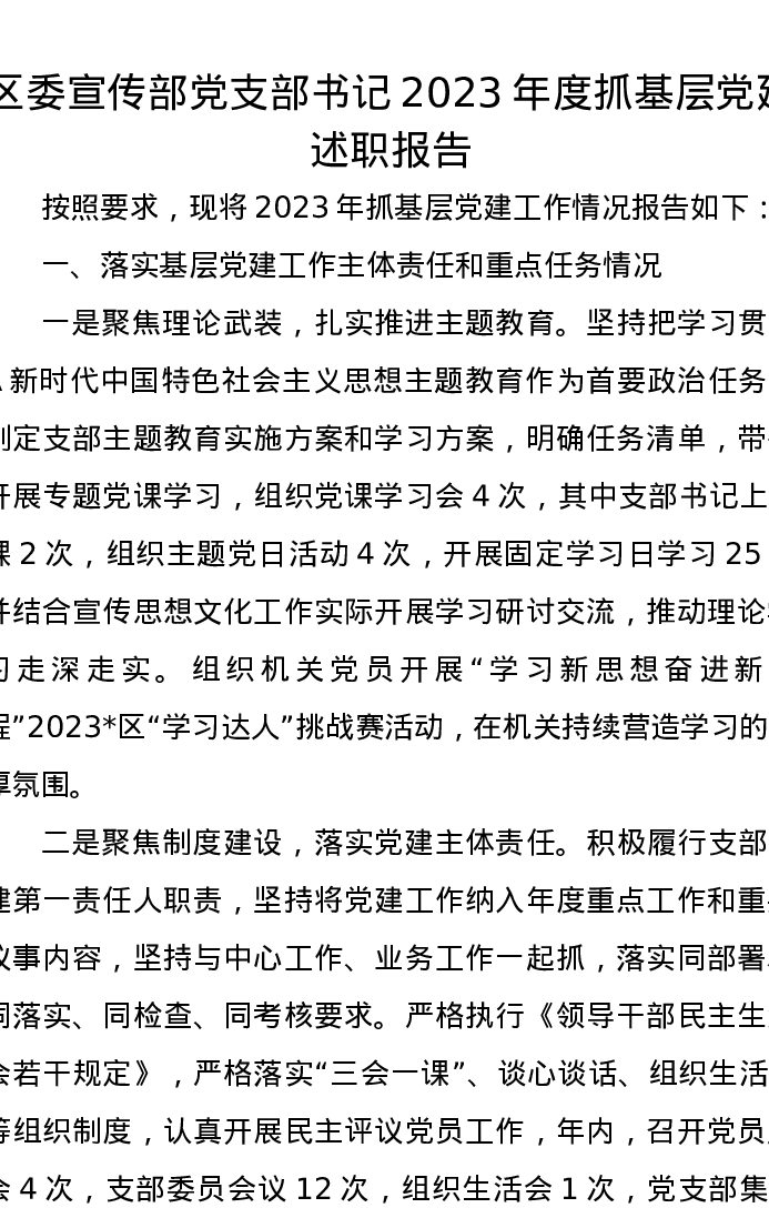 区委宣传部党支部书记2023年度抓基层党建述职报告(落实基层党建工作主体责任和重点任务、意识形态、党风廉政建设责任制三个方面)