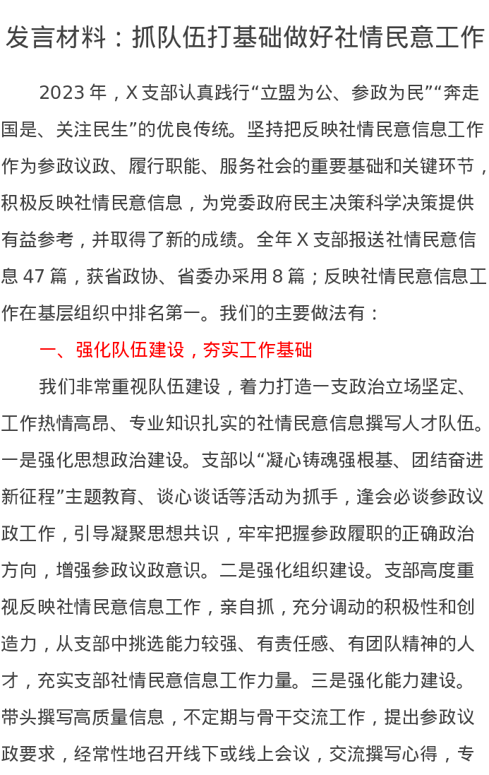 发言材料:抓队伍打基础做好社情民意工作