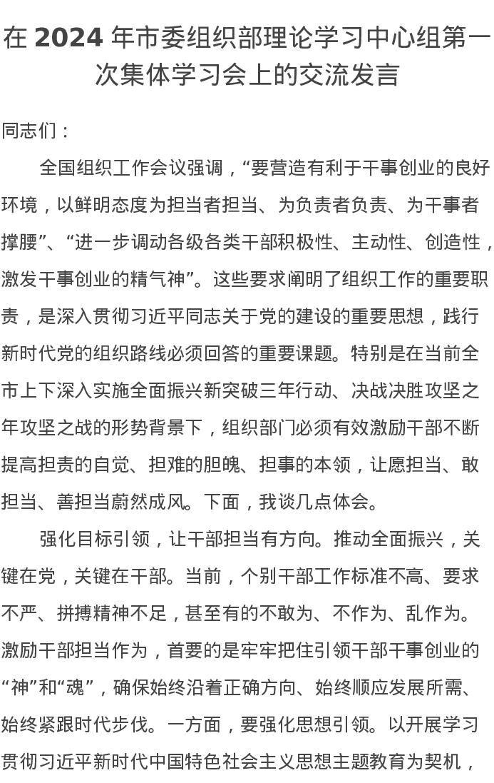 在2024年市委组织部理论学习中心组第一次集体学习会上的交流发言
