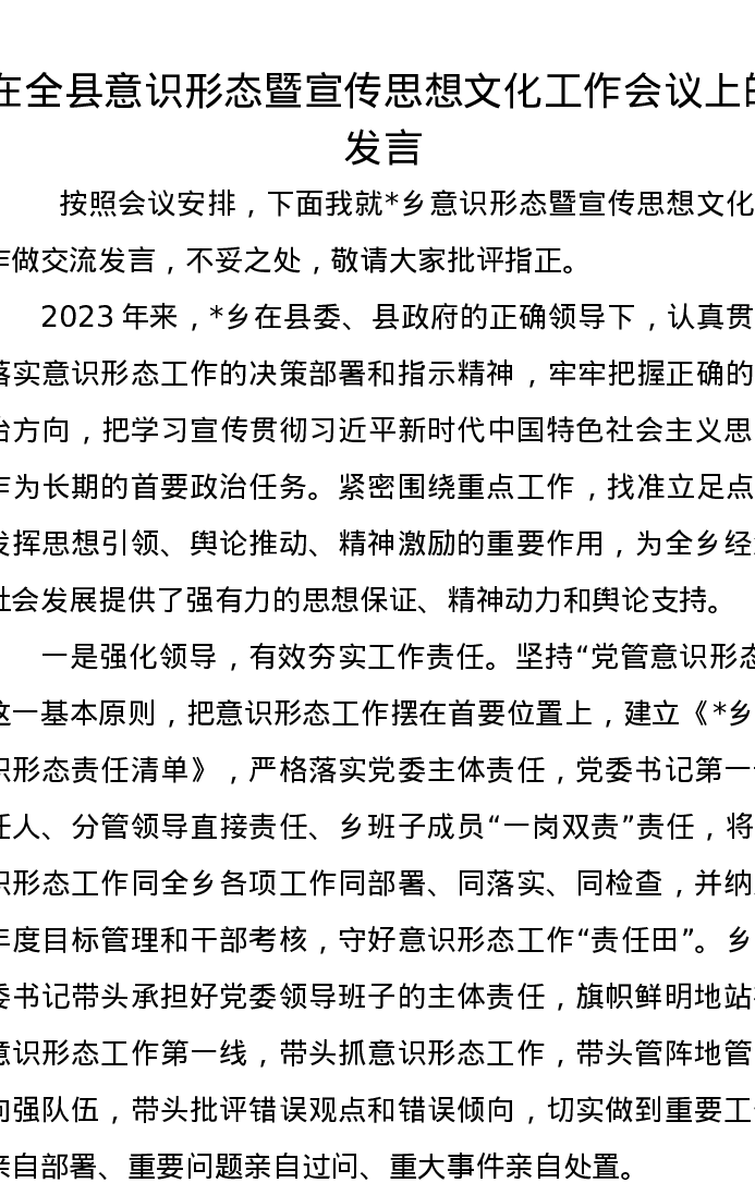 在全县意识形态暨宣传思想文化工作会议上的发言