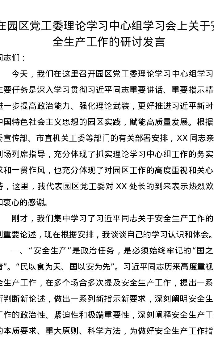 在园区党工委理论学习中心组学习会上关于安全生产工作的研讨发言
