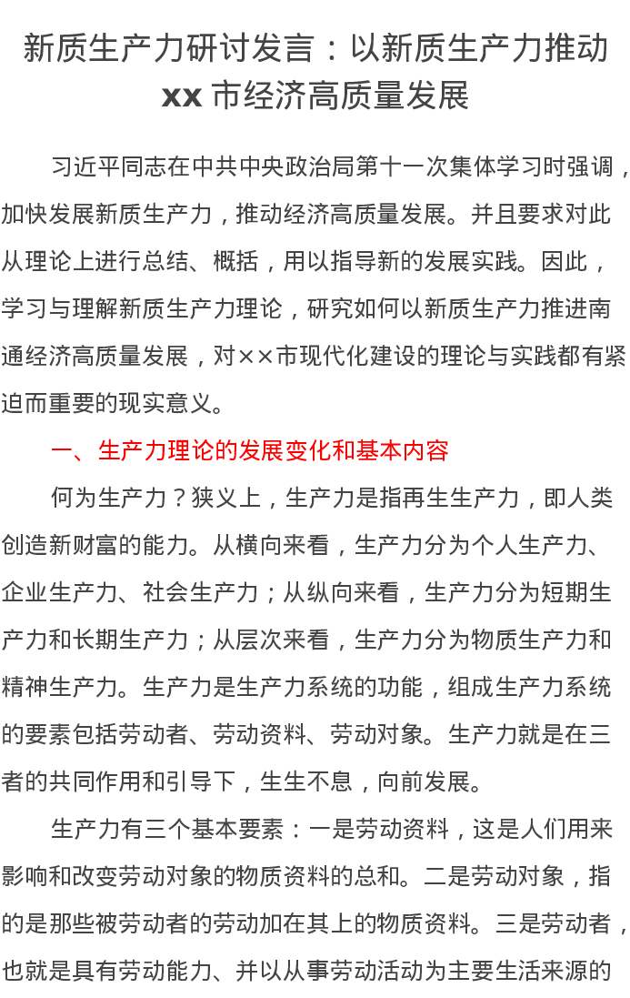 新质生产力研讨发言:以新质生产力推动xx市经济高质量发展