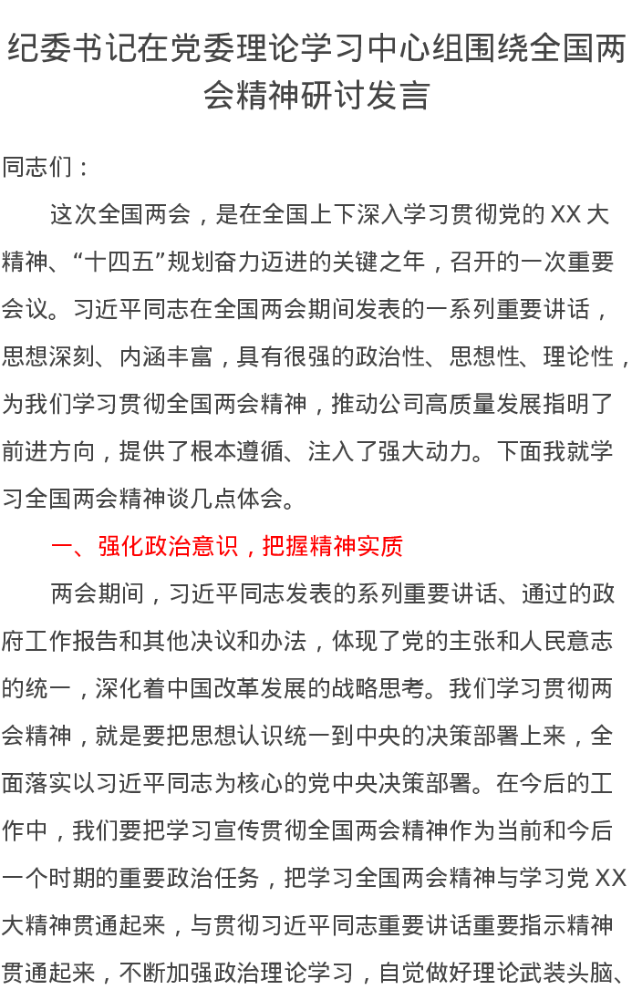 纪委书记在党委理论学习中心组围绕全国两会精神研讨发言