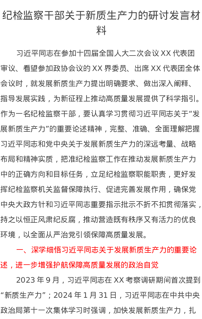 纪检监察干部关于新质生产力的研讨发言材料