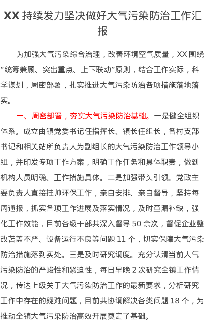 XX持续发力坚决做好大气污染防治工作汇报
