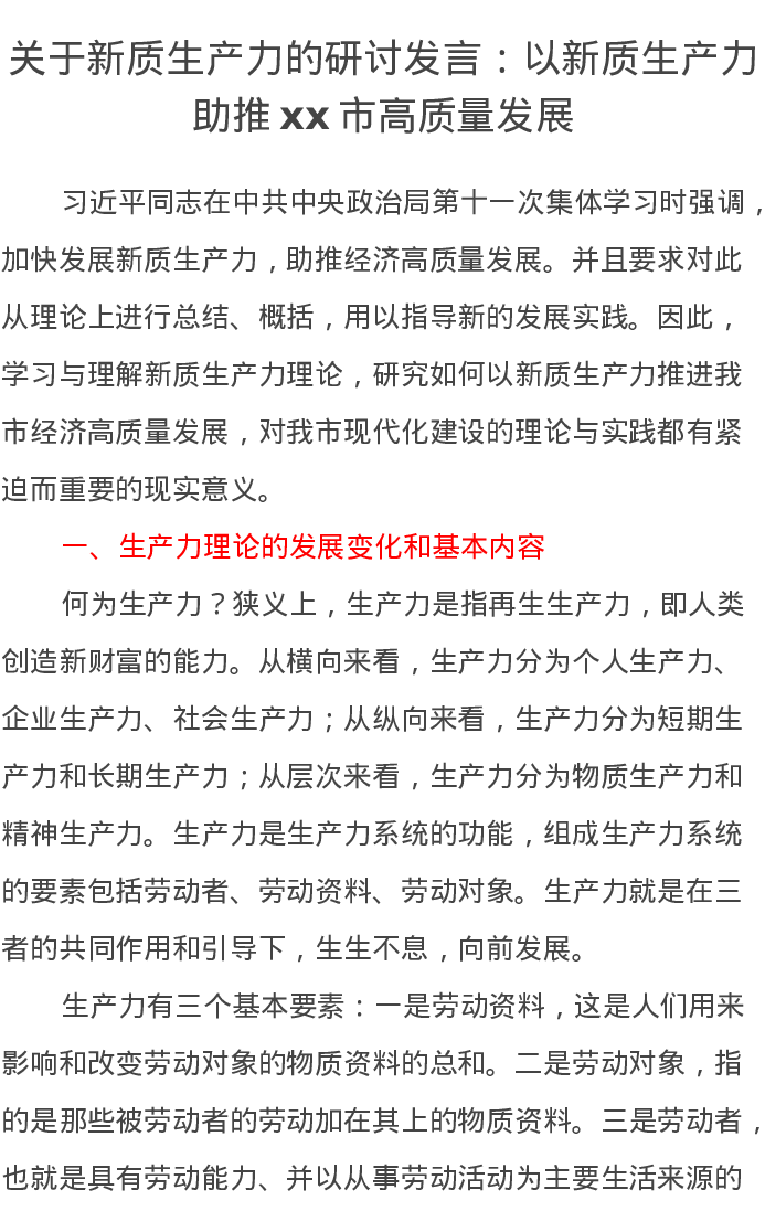 关于新质生产力的研讨发言:以新质生产力助推xx市高质量发展