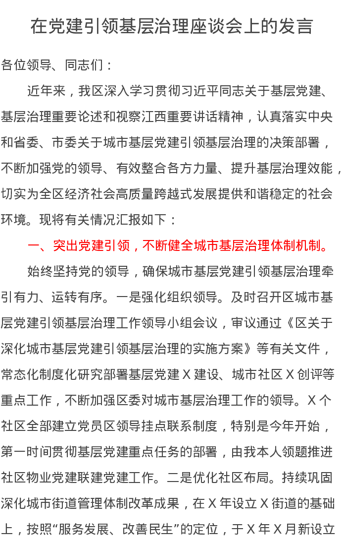在党建引领基层治理座谈会上的发言