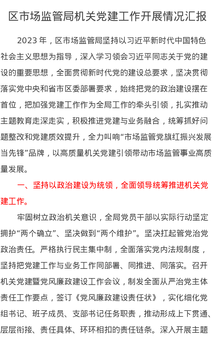 区市场监管局机关党建工作开展情况汇报