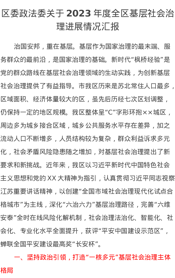 区委政法委关于2023年度全区基层社会治理进展情况汇报
