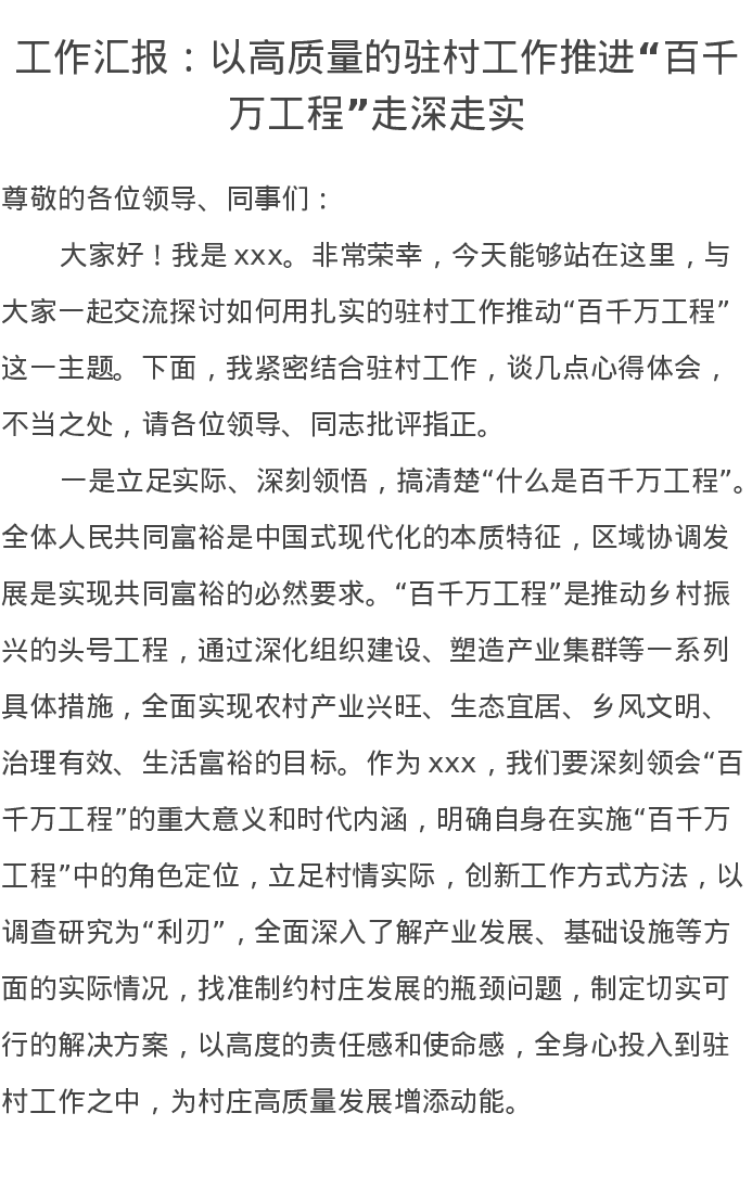 工作汇报:以高质量的驻村工作推进“百千万工程”走深走实