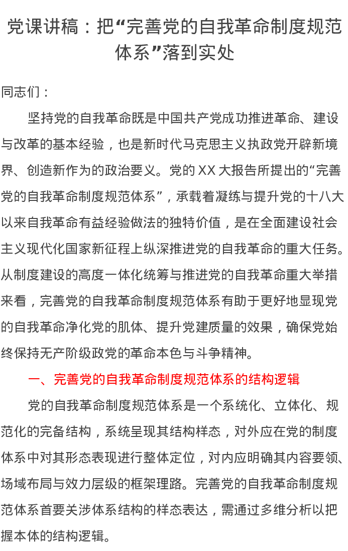 党课讲稿:把“完善党的自我革命制度规范体系”落到实处