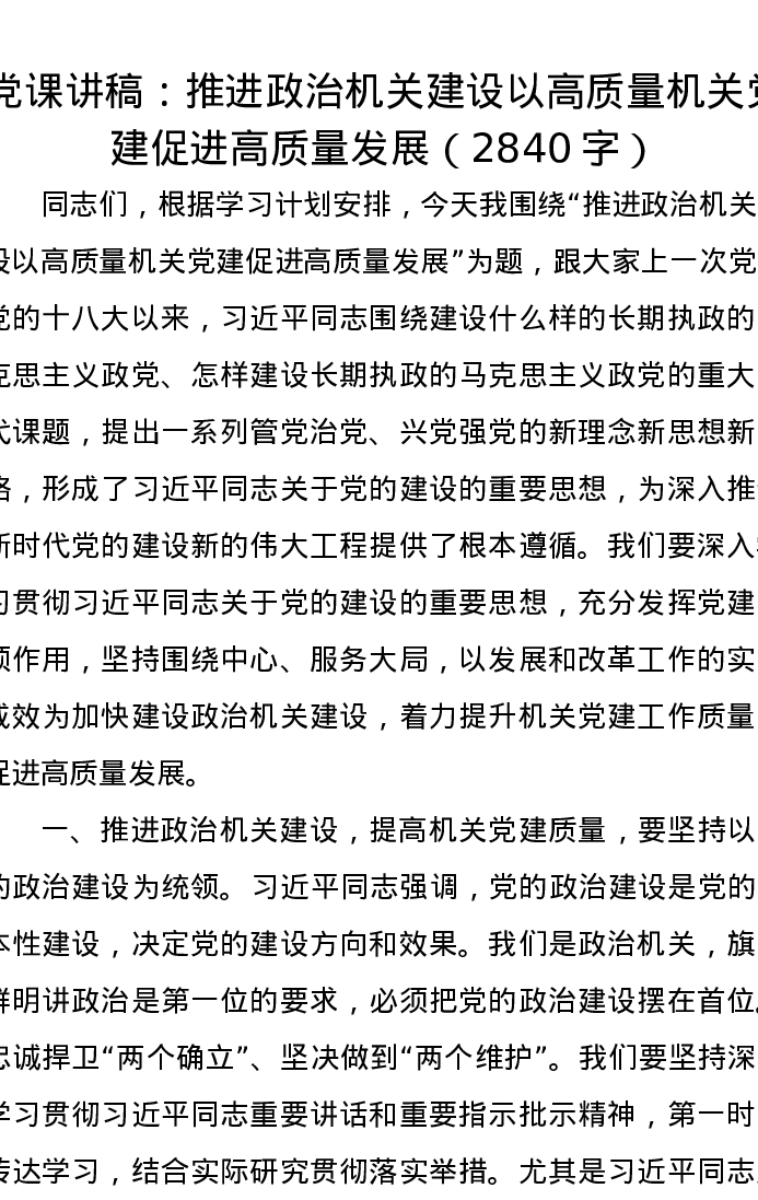 党课讲稿:推进政治机关建设以高质量机关党建促进高质量发展