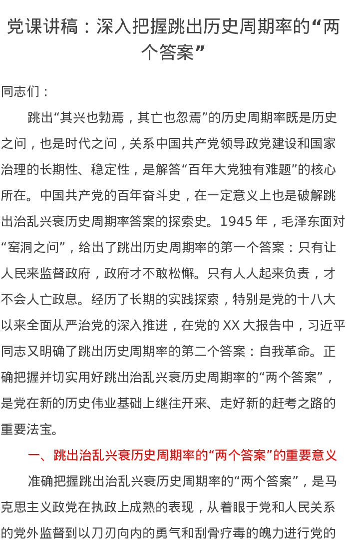 党课讲稿:深入把握跳出历史周期率的“两个答案”