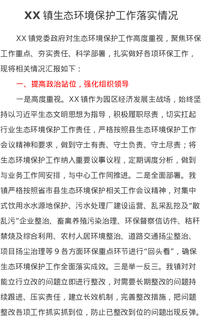 XX镇生态环境保护工作落实情况汇报