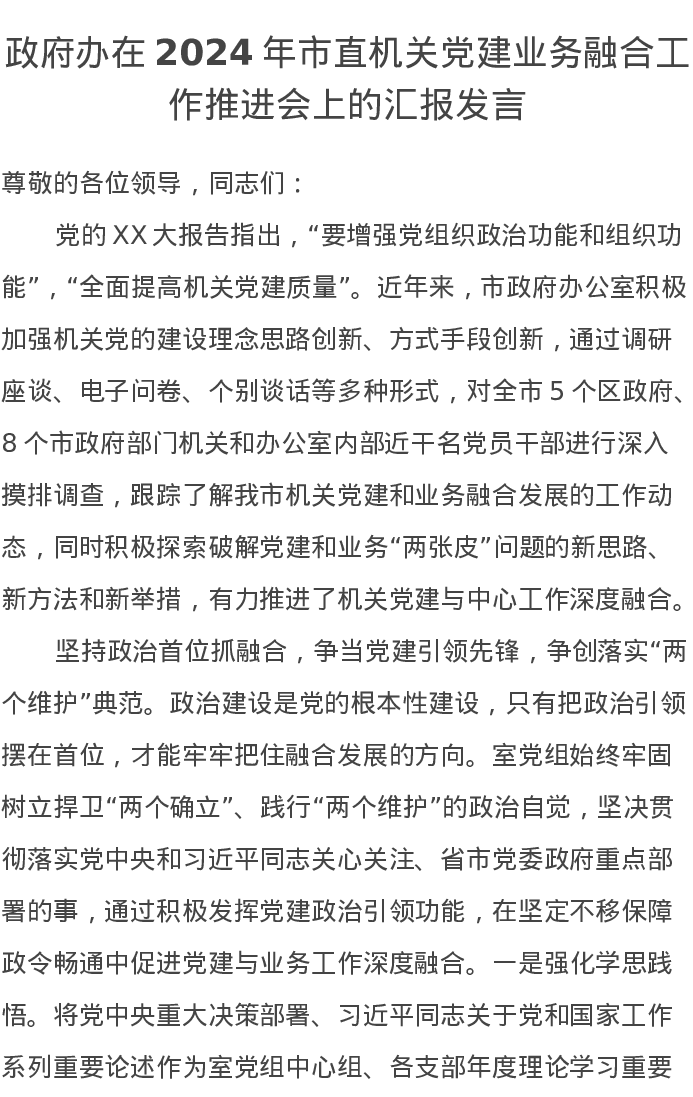 政府办在2024年市直机关党建业务融合工作推进会上的汇报发言