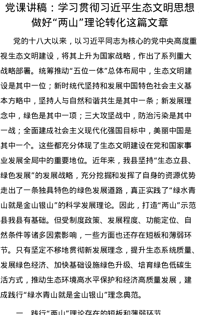 党课讲稿:学习贯彻习近平生态文明思想,做好“两山”理论转化这篇文章
