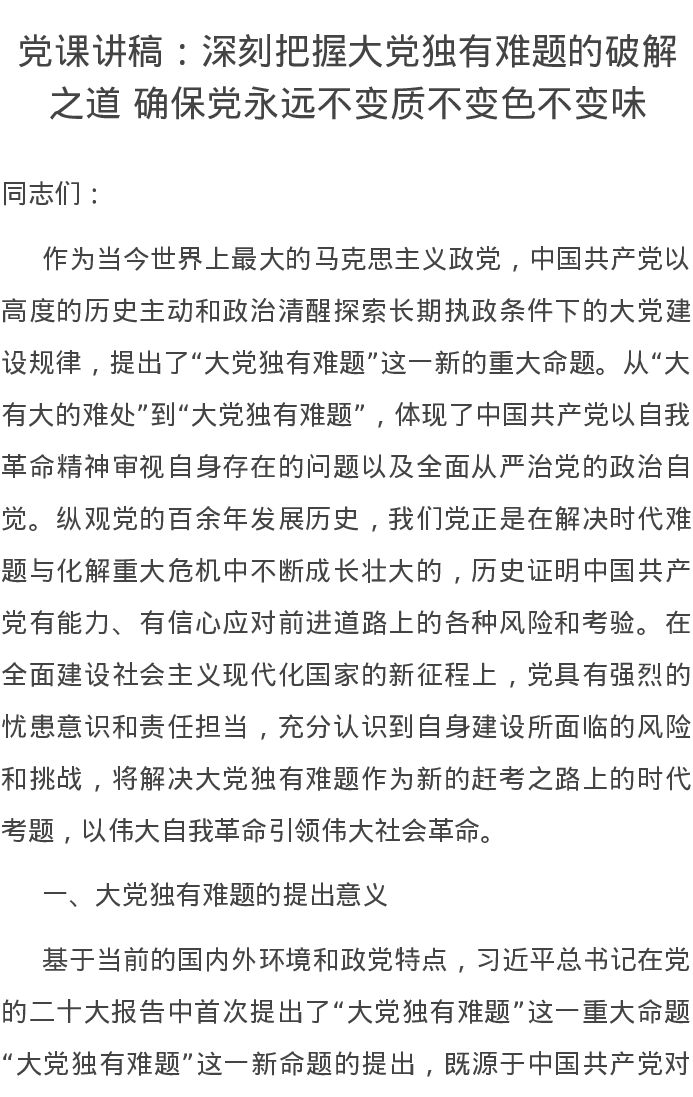 党课讲稿:深刻把握大党独有难题的破解之道 确保党永远不变质不变色不变味