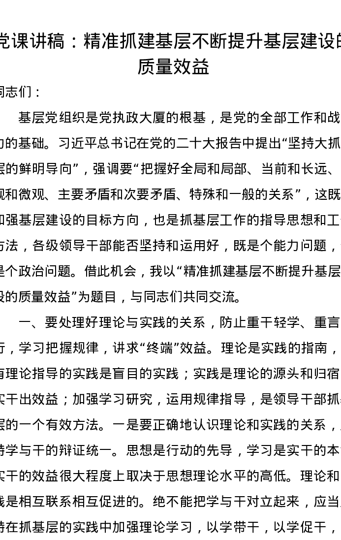 党课讲稿:精准抓建基层不断提升基层建设的质量效益