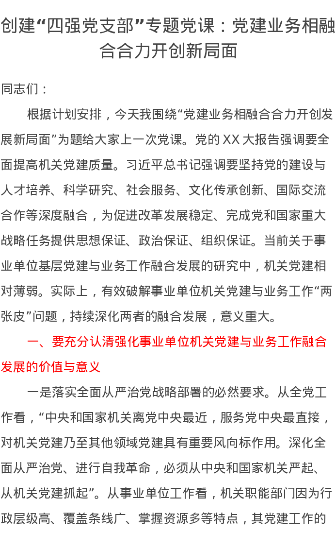 创建“四强党支部”党课讲稿:党建业务相融合合力开创新局面