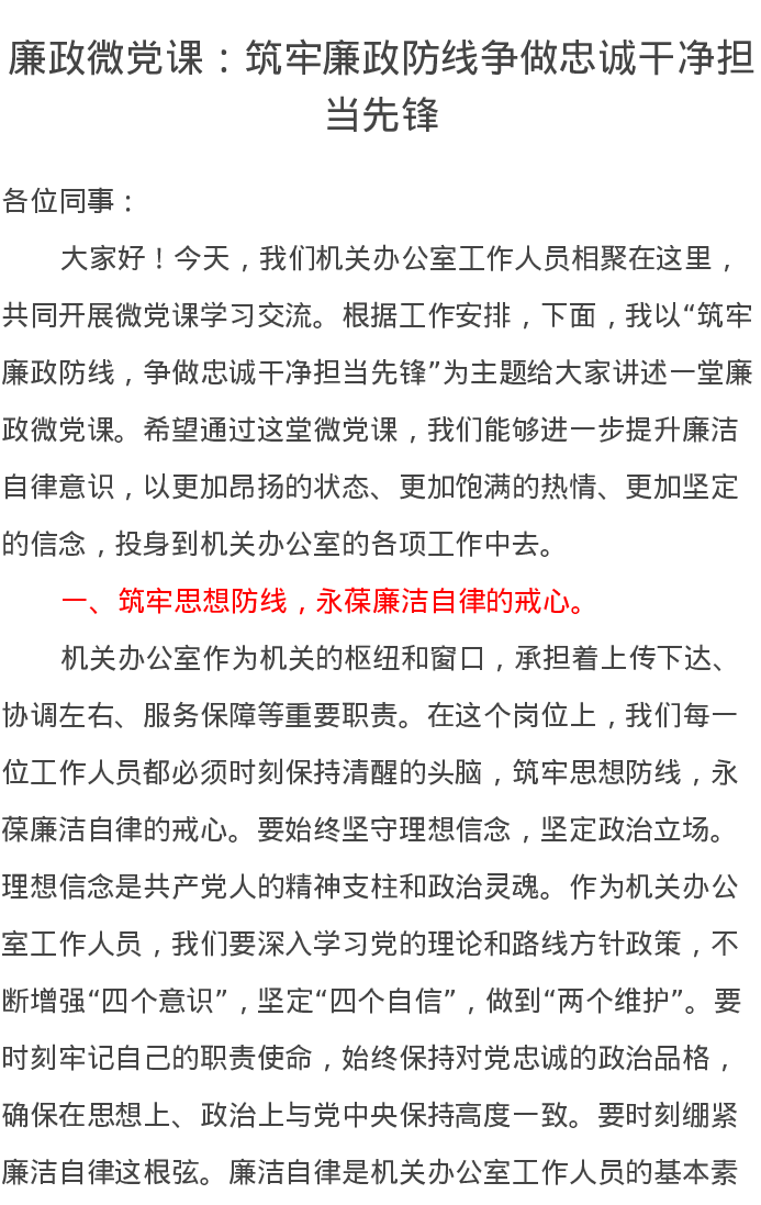 廉政微党课讲稿:筑牢廉政防线争做忠诚干净担当先锋