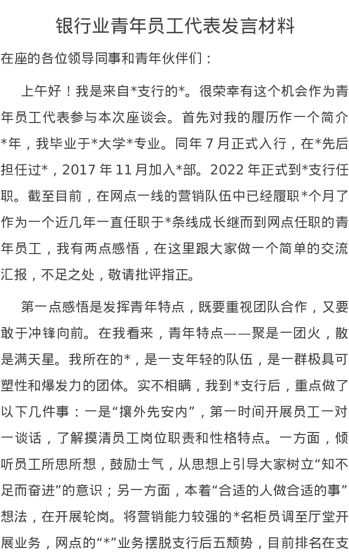 银行业青年员工代表发言材料
