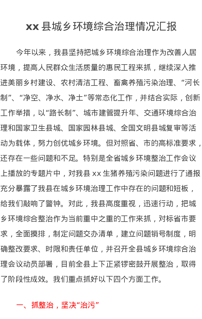 xx县城乡环境综合治理情况汇报